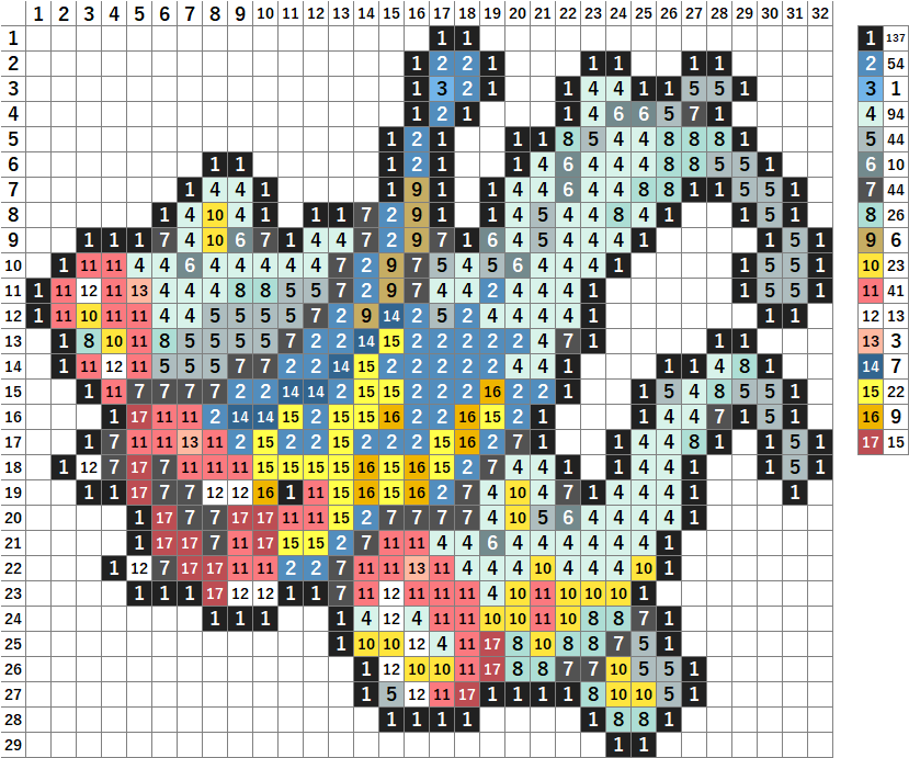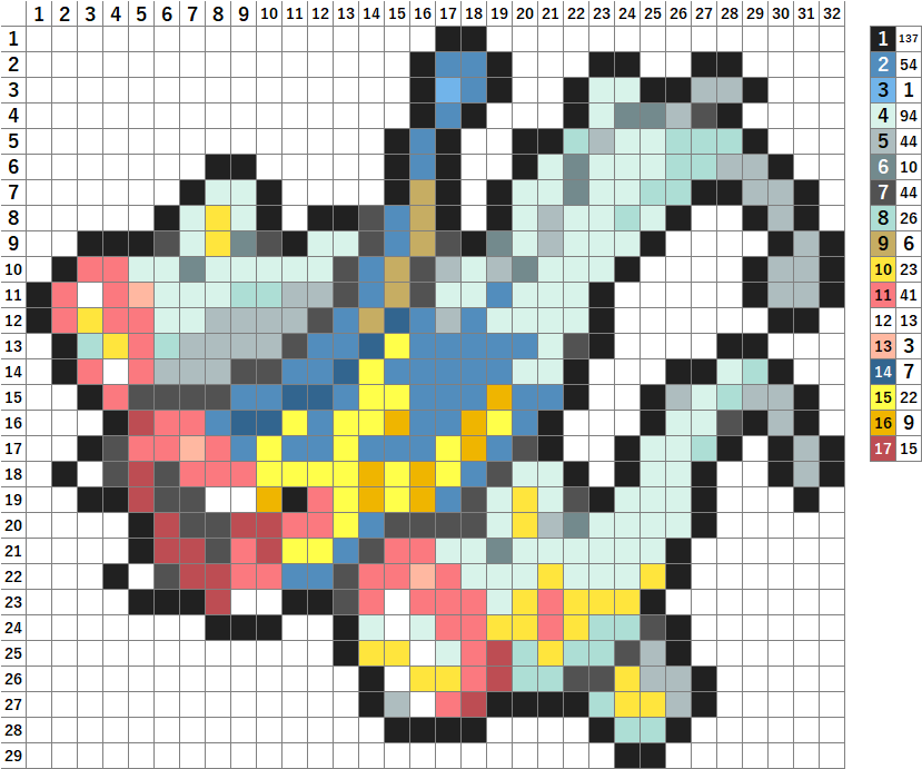 今回はポケモンのメガシビルドンのドット絵です!アイロンビーズやアクアビーズ、マイクラ、クロスステッチの図案にどうぞ。