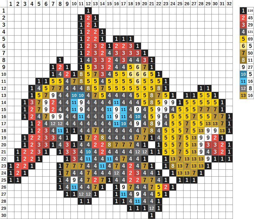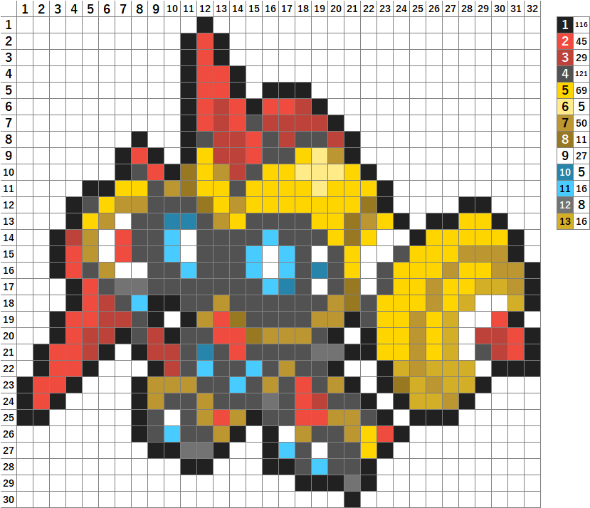 今回はポケモンのメガタイレーツのドット絵です!アイロンビーズやアクアビーズ、マイクラ、クロスステッチの図案にどうぞ。